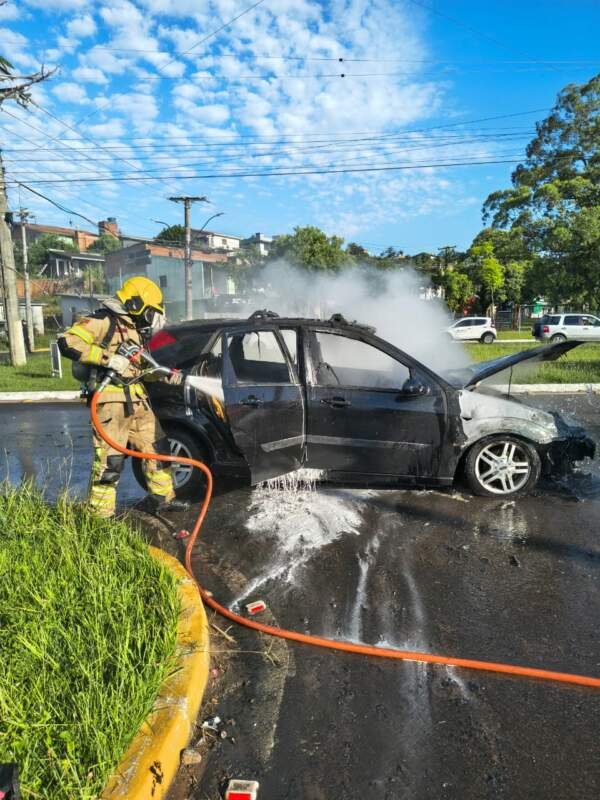 Um carro Ford Focus, de cor preta, pegou fogo na manhã desta terça-feira, por volta das 7h22, na Avenida dos Municípios, na entrada do bairro Vila Rica, em Campo Bom.