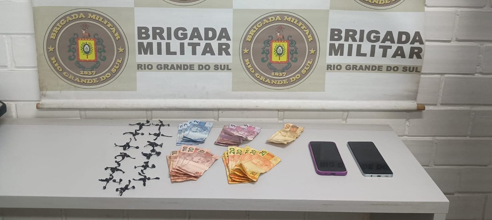 Os policiais solicitaram que a suspeita sacudisse a camiseta, momento em que R$ 40,00 em dinheiro e um papel com anotações, possivelmente relacionadas ao tráfico, caíram do sutiã. Na sequência, foram encontrados mais R$ 253,00 em dinheiro escondidos sob um chinelo, além de dois aparelhos celulares. Diante dos fatos, foi dada voz de prisão aos envolvidos. Conforme o registro da ocorrência, foi necessário o uso de algemas para garantir a segurança da guarnição e dos próprios detidos.