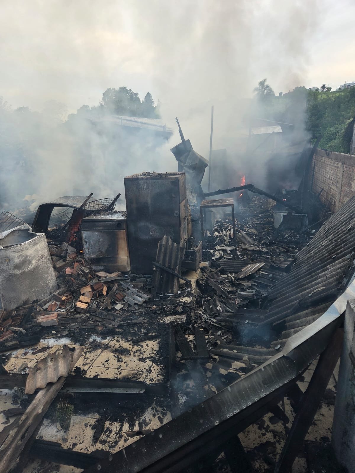 As chamas consumiram completamente uma residência de madeira, fazendo com que a família perdesse todos os seus pertences. Apesar dos danos materiais, ninguém ficou ferido.