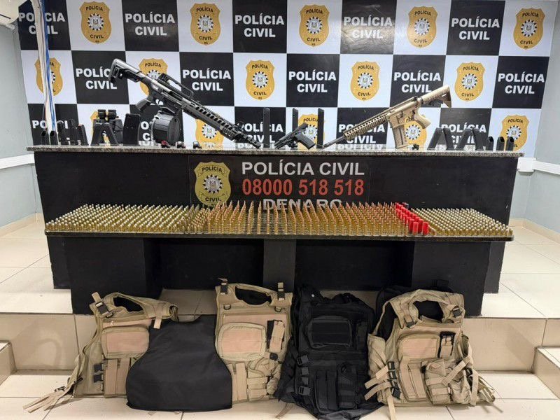 A operação, realizada sob a coordenação do delegado Wesley Lopes e integrada à Operação Desarme, resultou na apreensão de um verdadeiro arsenal. Entre os itens recolhidos estão uma espingarda automática calibre 12, uma carabina calibre 5,56, uma pistola calibre 9 mm, ambas com numeração suprimida, além de carregadores, miras, coletes balísticos, balaclavas, cerca de 500 munições de diversos calibres e um veículo Jetta blindado.